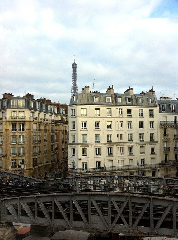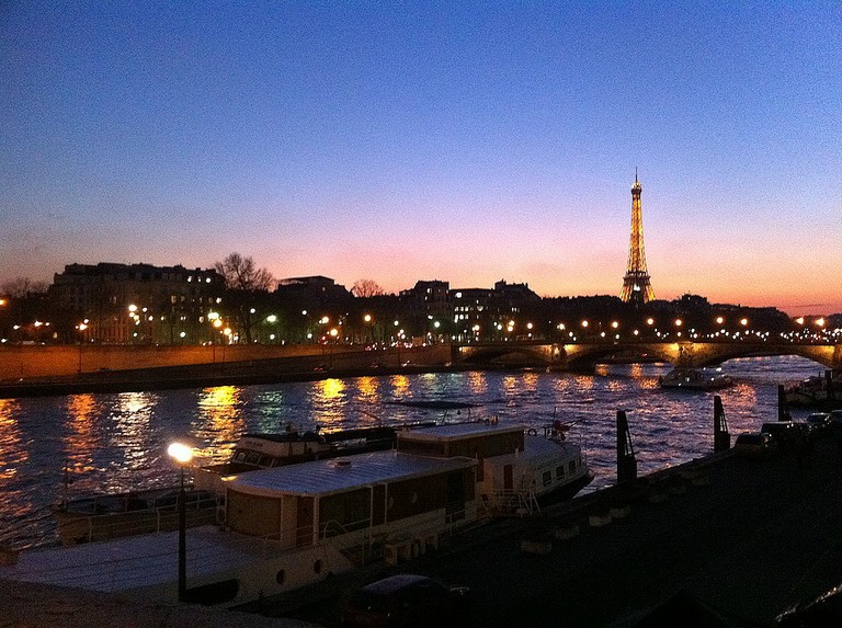 - Au fond, le passerelle Debilly; des péniches amarrées en bord de Seine