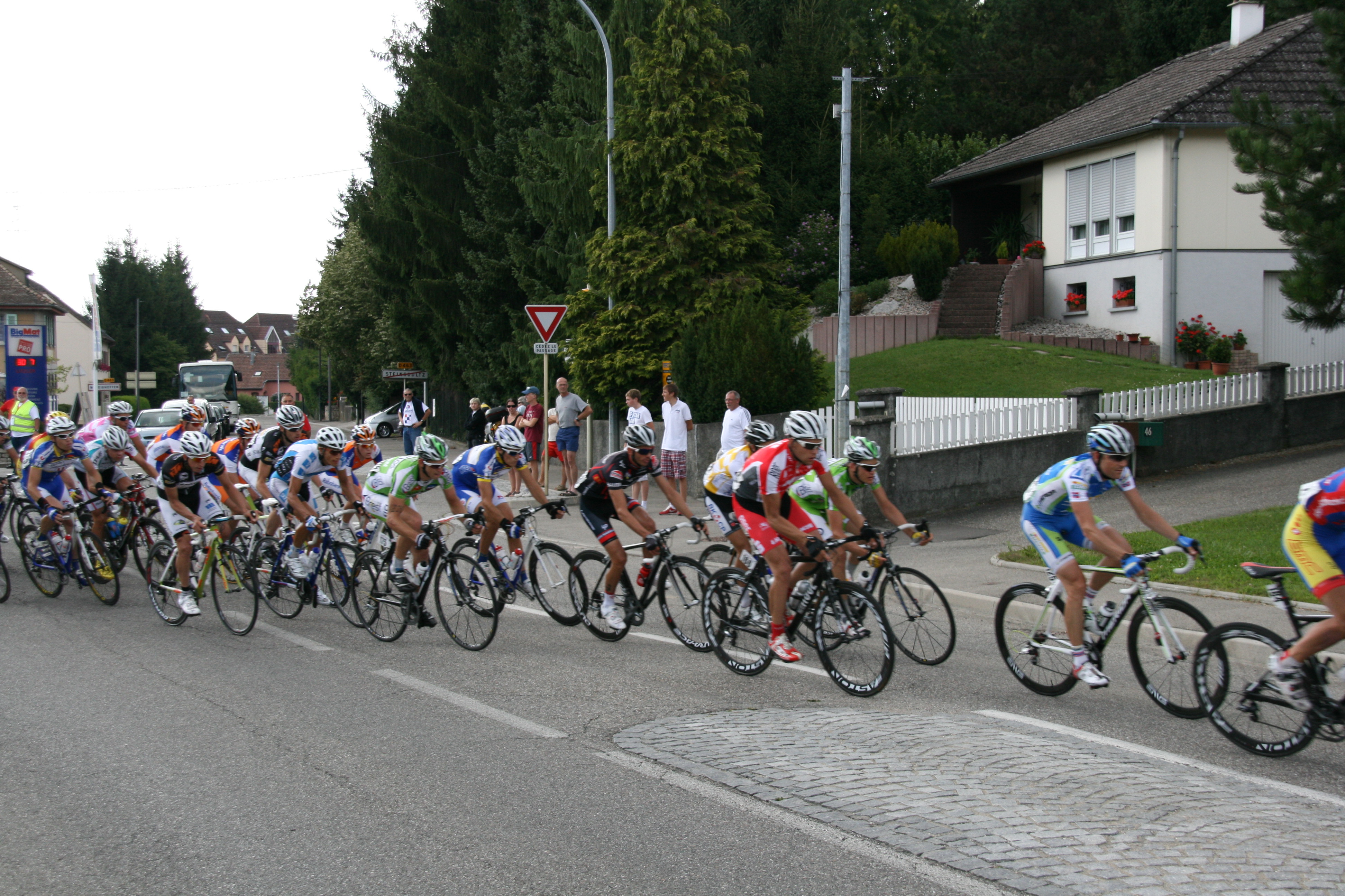 Le début du peloton lors de la 4ème étape du Tour d'Alsace 2011, passant à côté de la Commune de Waldighoffen.