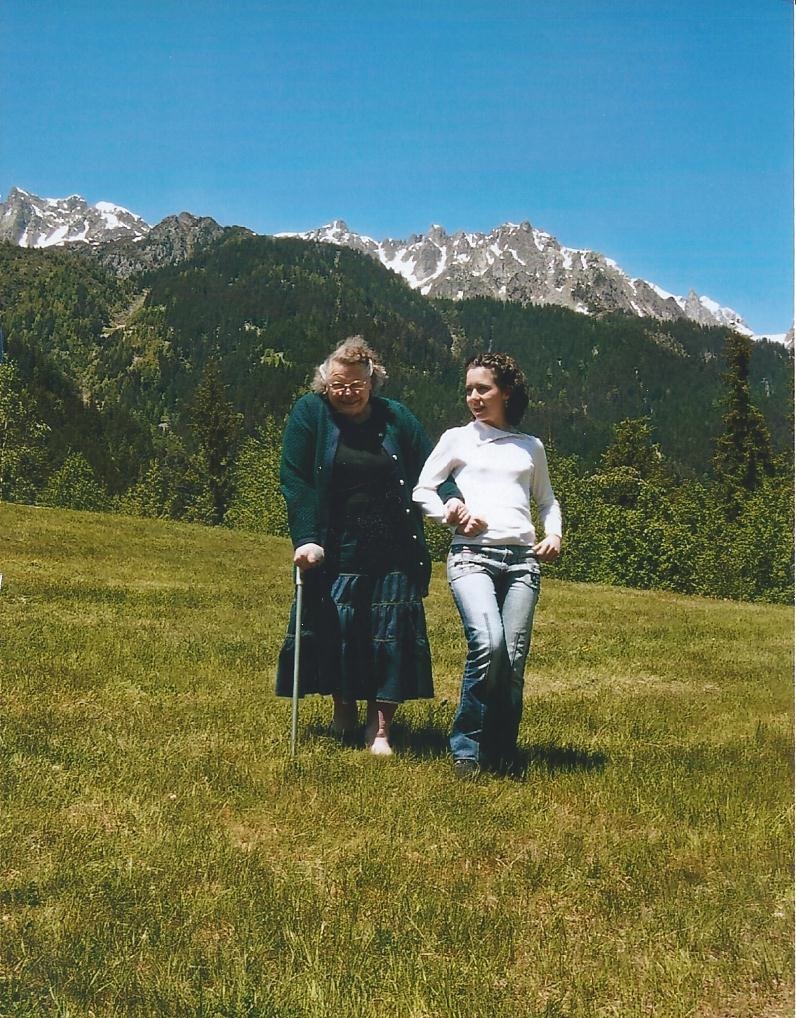 Marlène Pernot-Steiner en promenade en montagne avec une petite fille, où elle s'était établie avec son mari et ses enfants.
