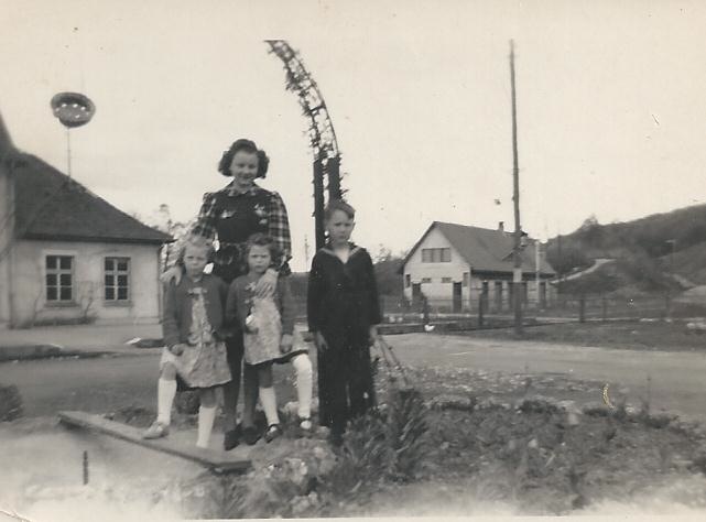 Photo ancienne montrant Marlène Pernot-Steiner enfant avec une dame et deux autres enfants. Elle est la petite fille à gauche de la photo.
