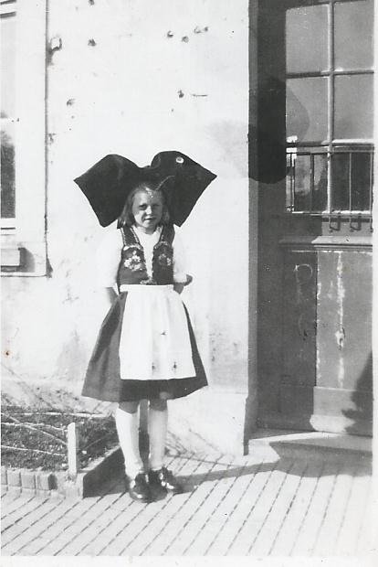Marlène Pernot-Steiner enfant à Waldighoffen, en habits traditionnels alsacien, portant la coiffe.