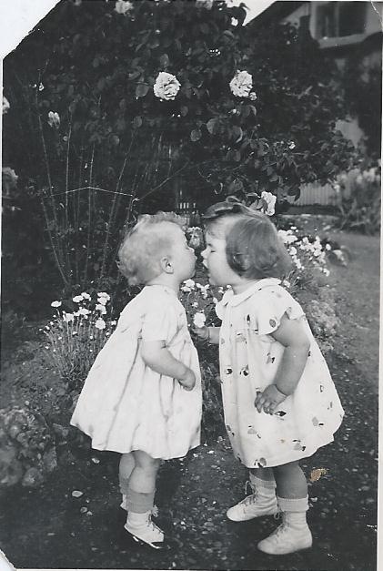 Jolie photo d'époque de Marlène Pernot-Steiner petite fille, vêtue d'une robe, qui se prépare à faire un bisou à sa soeur.