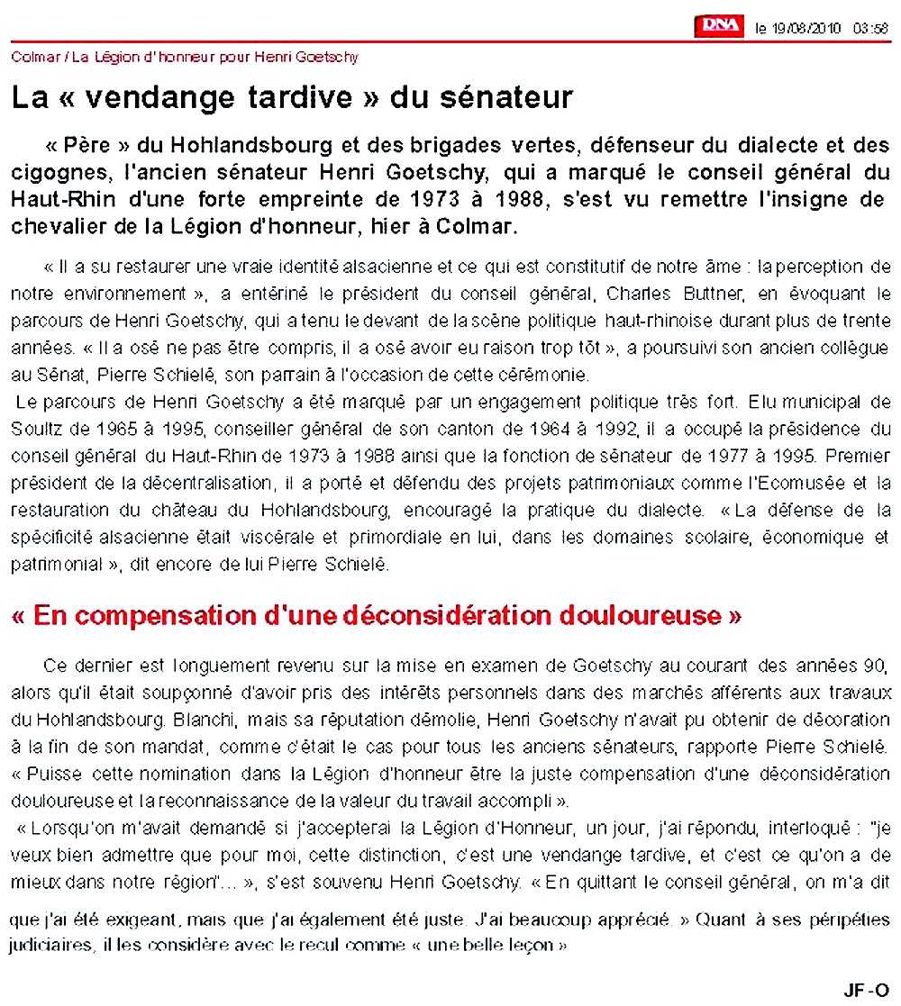 Article des DNA du 19 08 2010 concernant la remise de la Légion d'Honneur de Henri Goetschy