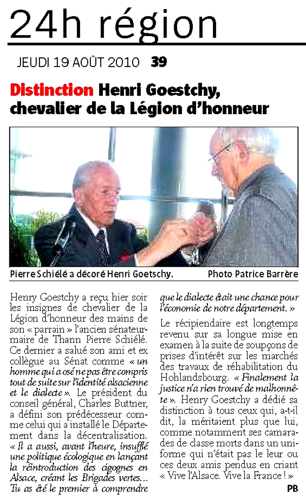 Article de l'Alsace du 19 08 2010 concernant la remise de la Légion d'Honneur de Henri Goetschy