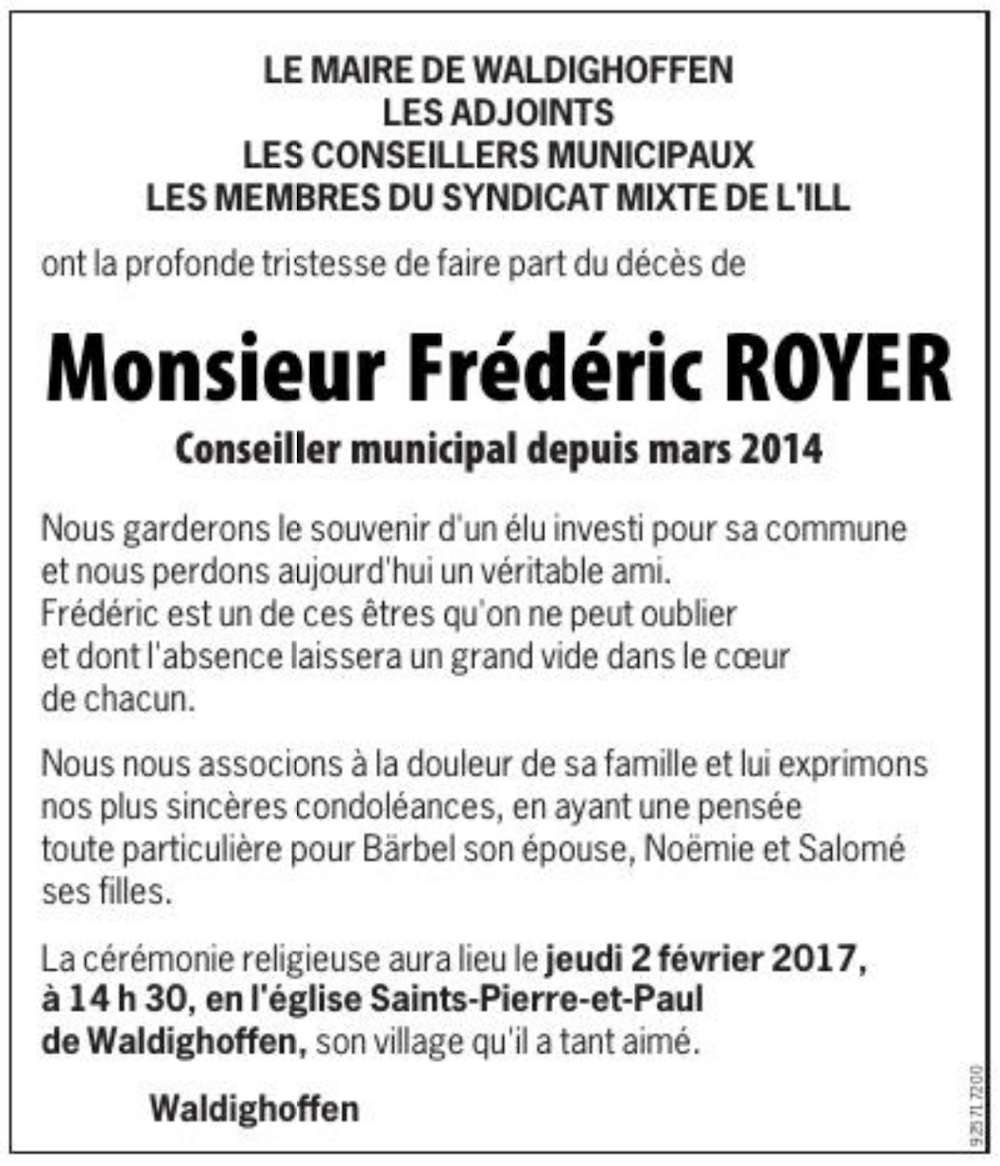 Avis de décès de Frédéric Royer paru dans l'Alsace le 31 janvier 2017.