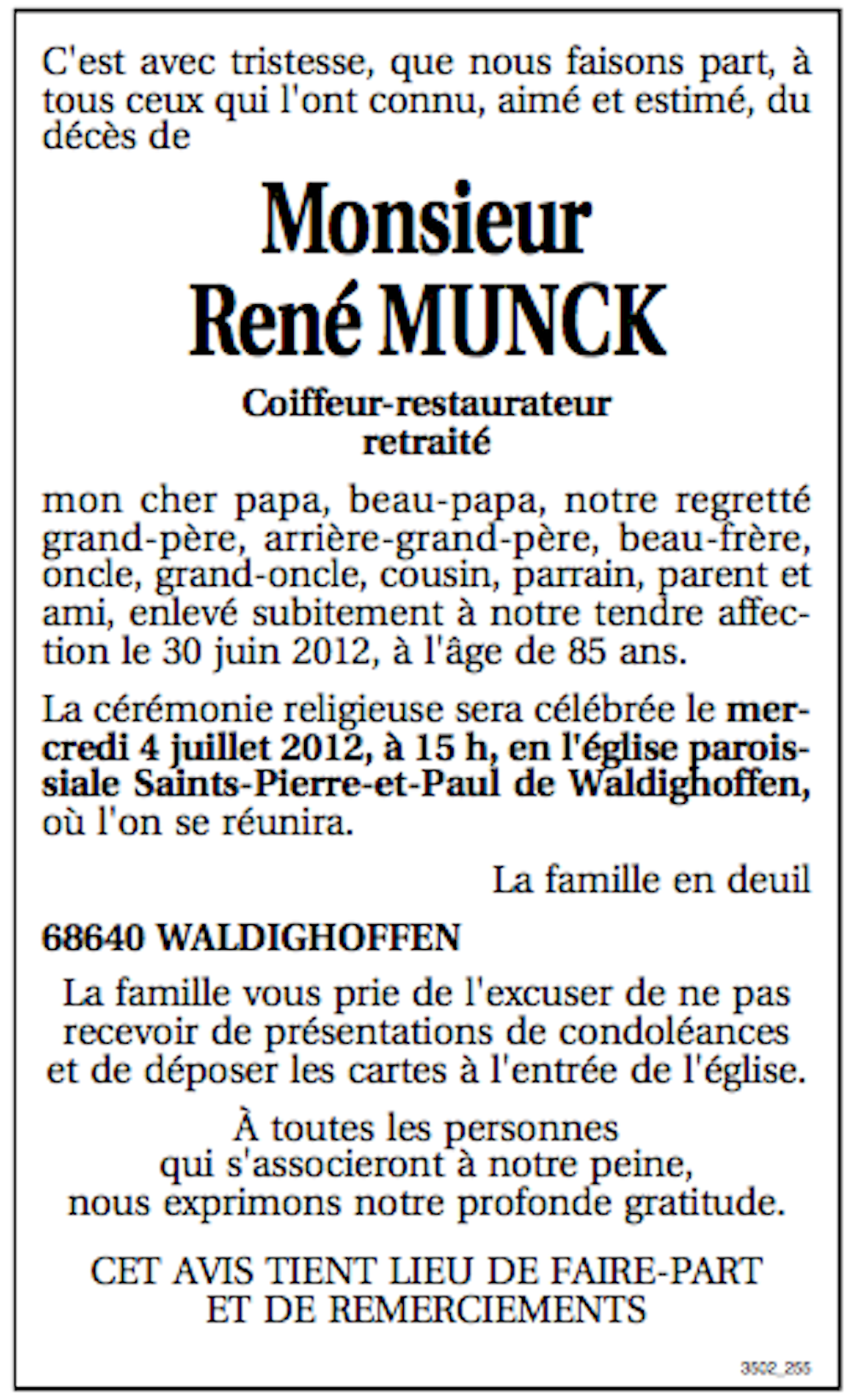L'avis de décès Monsieur Munck René de Waldighoffen, décédé à Waldighoffen le 30 juin 2012.
