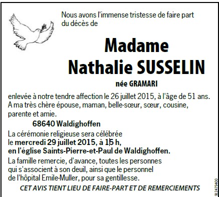 Avis de décès SUSSELIN Nathalie, décédée le 26 juillet 2015