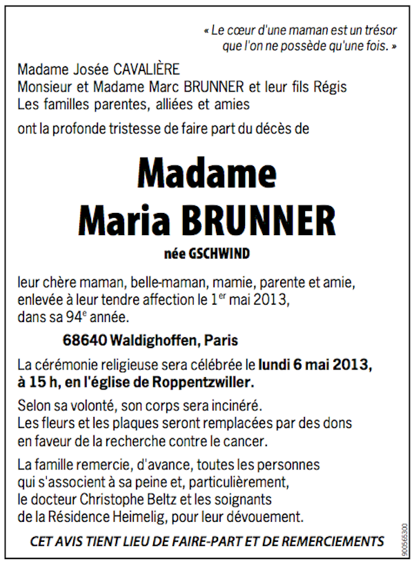 Avis de décès paru dans L'Alsace pour le décès de Madame Brunner Maria le 1er mai 2013.