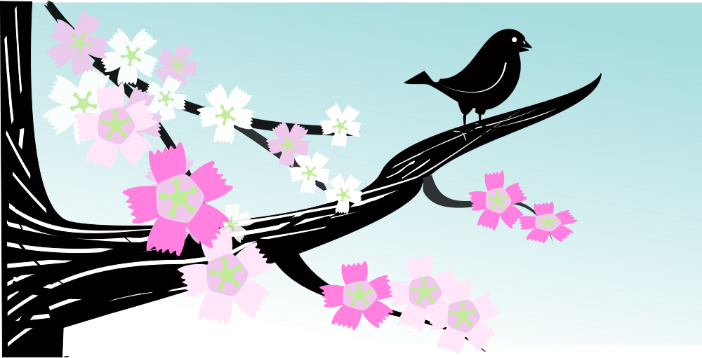 Dessin d'un oiseau sur une branche en fleurs.
