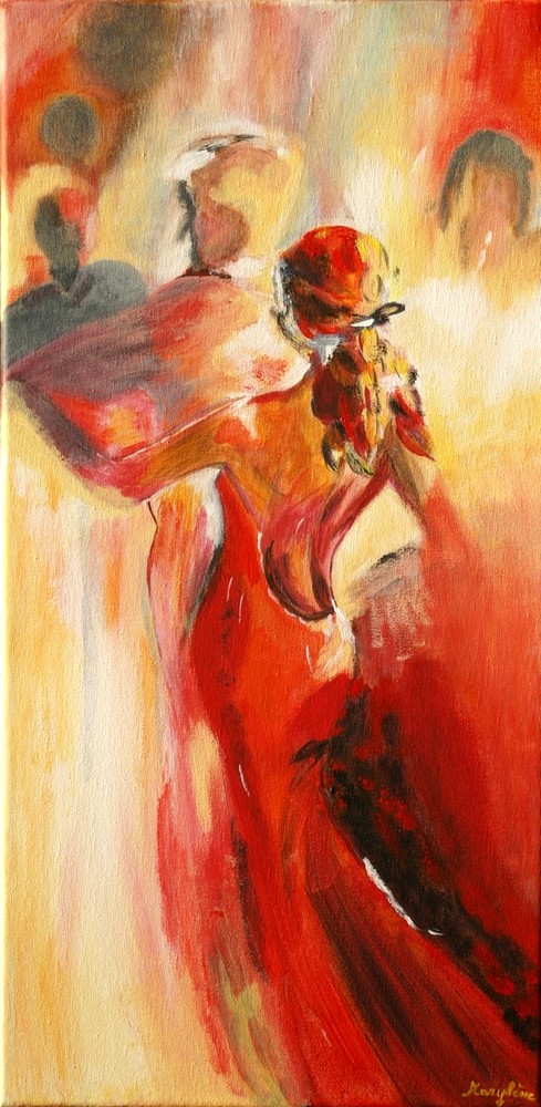 Couple de danseurs dans une soirée. L'ambiance du tableau est dans les couleurs chaudes rouge et beige. La femme, au premier plan, a une longue robe rouge dos nu et des cheveux noués.