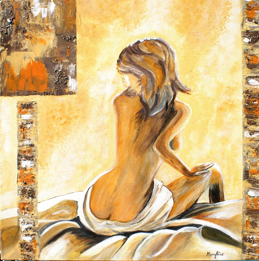 Femme assise sur un lit. Son dos est nu; les couleurs du tableau sont dans les beige-brun.