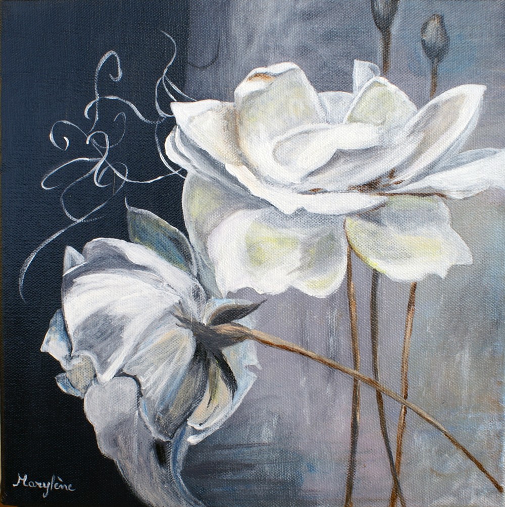 Deux roses blanches et deux boutons dont les tiges sont entrelacées sur fond noir et gris