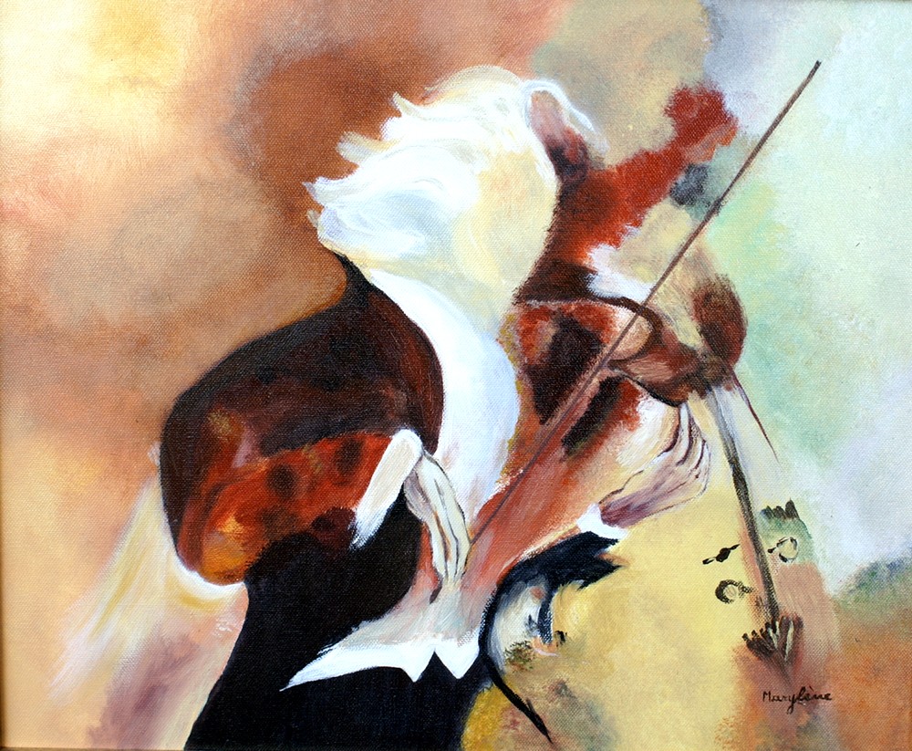 Tableau d'un violoncelliste peint avec son instrument dans le mouvement