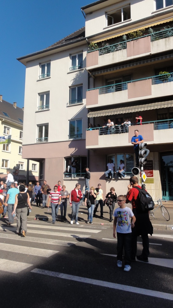 rallye de france alsace - specateurs sur les balcons et feu rouge.JPG