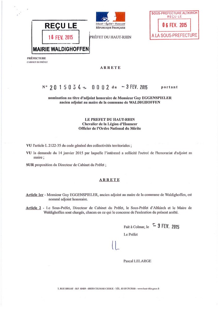 Vous êtes ici : Accueil Au fil du temps… Waldighoffen à travers ses habitants Maire et Adjoint honoraire Nomination de Monsieur Guy EGGENSPIELER