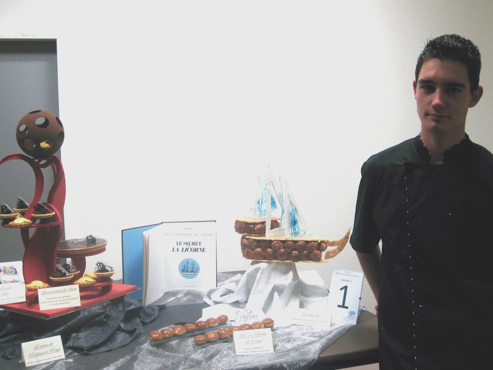 Lucas Riegert posant pour une photo souvenir devant ses 3 réalisations pour le concours de meilleur apprenti pâtissier d'Alsace 2011.
