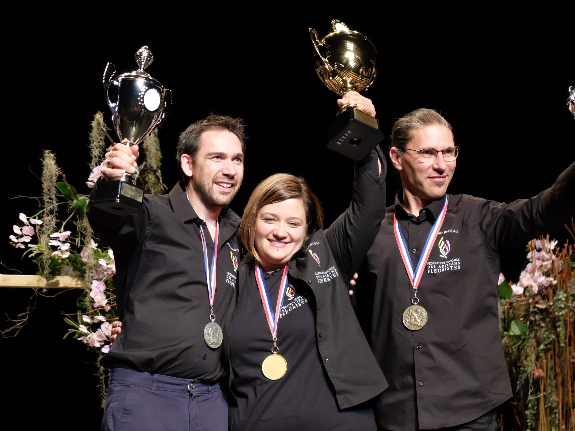 Photo du podium de la coupe du France 2019 des fleuristes 2019 - source Facebook page Sundgau Fleurs Aurélie Ruetsch.