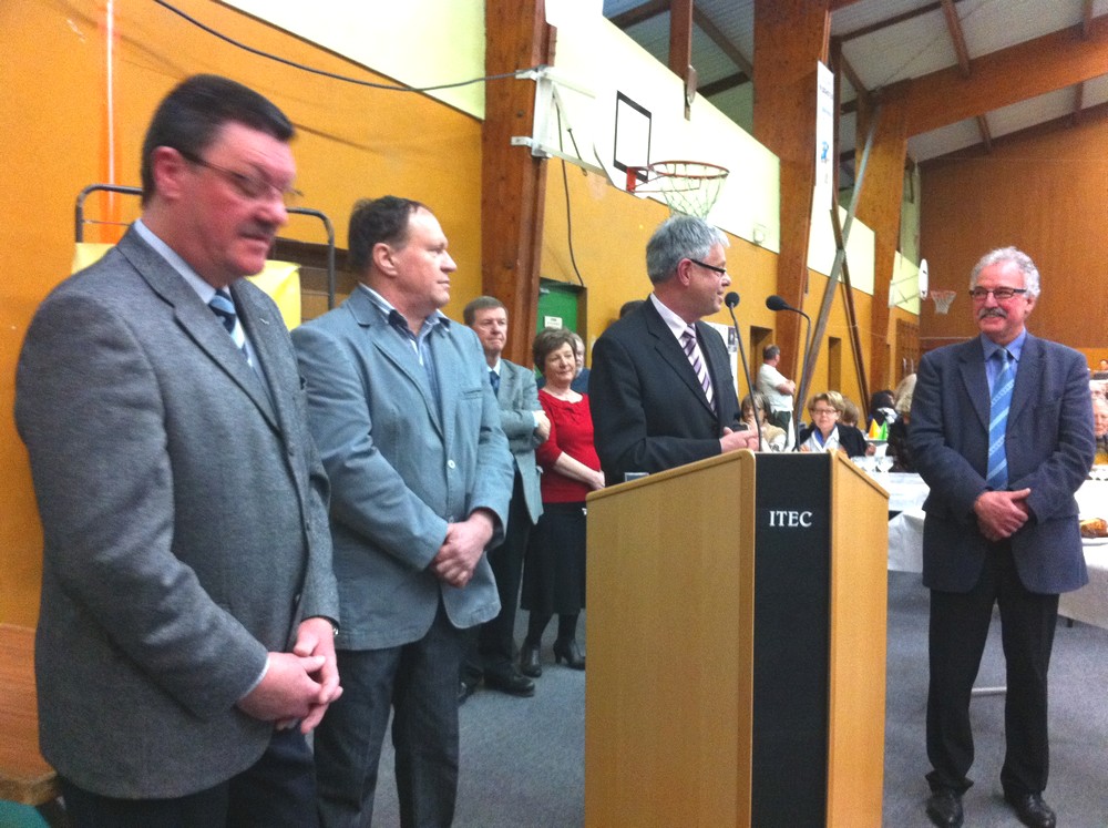 Henri Hoff félicite messieurs Gussy et Scherrer, en présence de M. Reinhard, le conseiller général