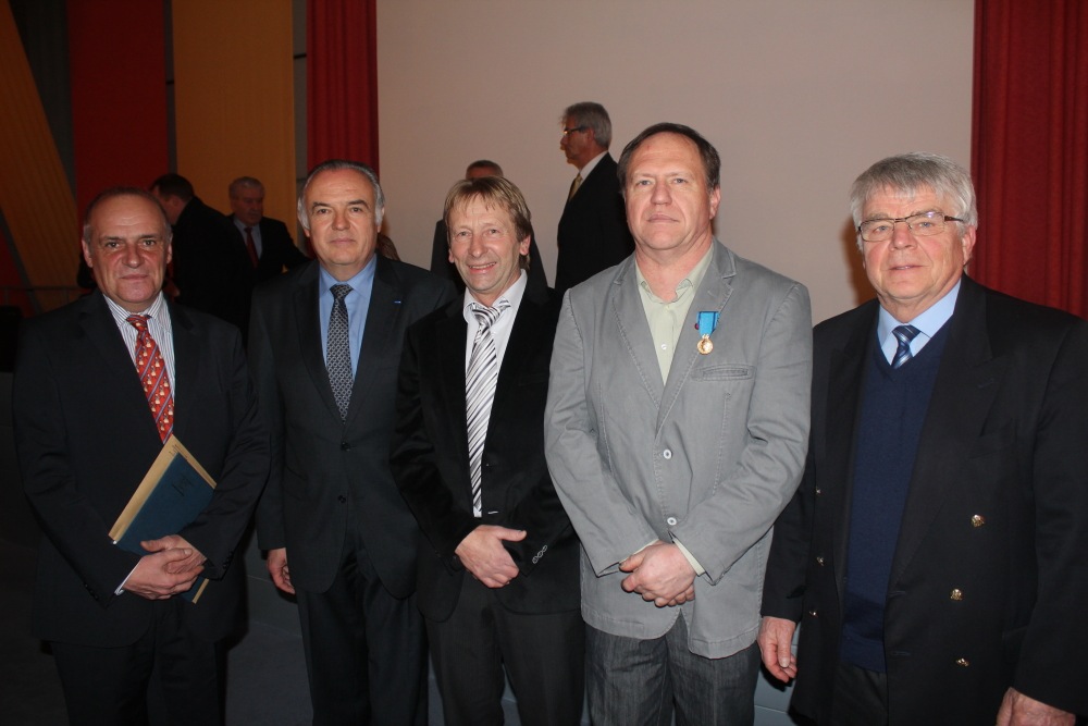 M. Gussy entouré de M. SCHMITT Alain (Maire d'Henflingen) , M. SCHMITT Jean (ancien président du CSSPP) et d'officiels.