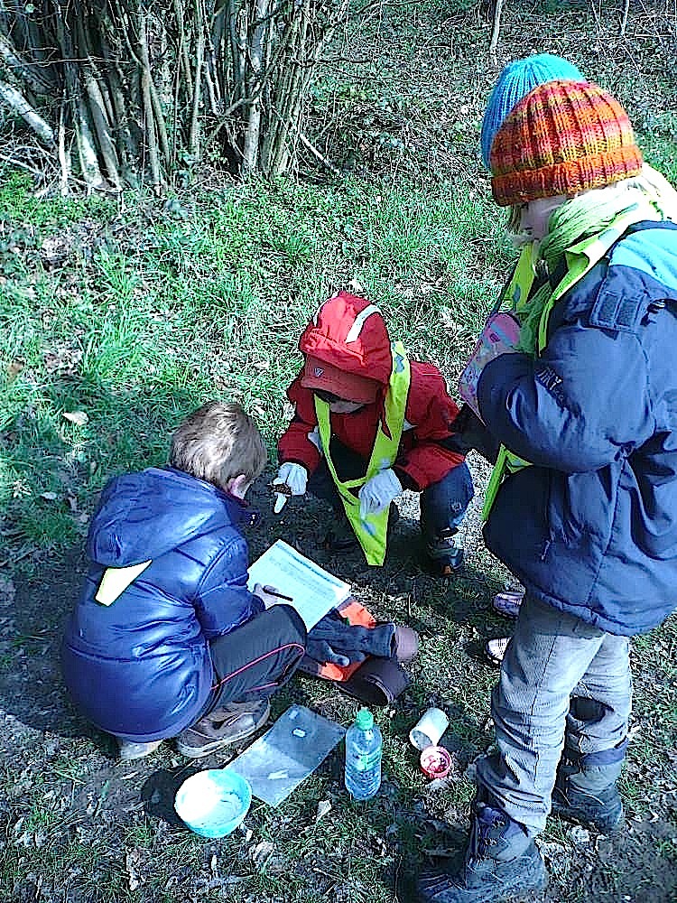 2013-04-04 CE1 - L'équipe relève une empreinte avec du plâtre et beaucoup de minutie...