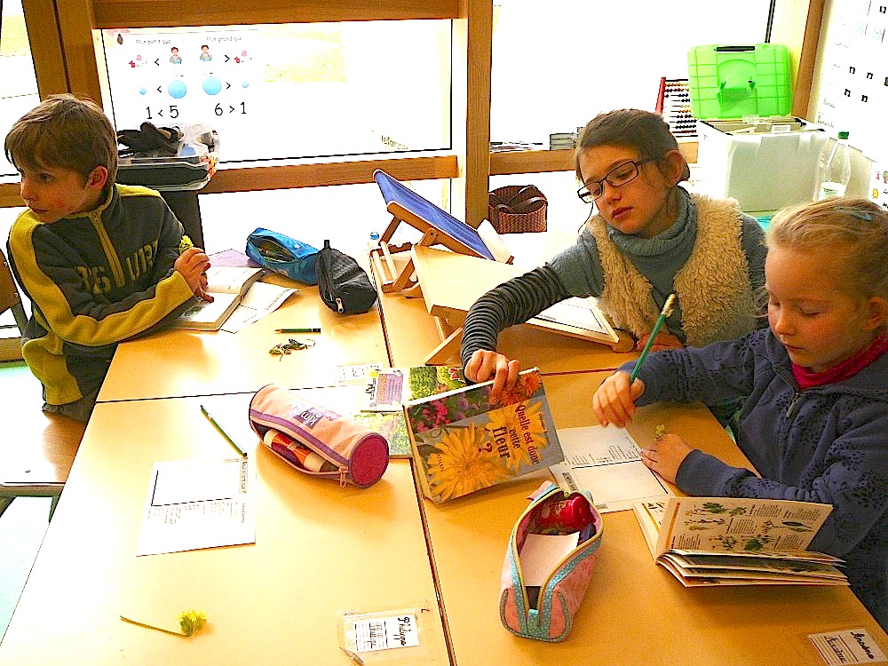 2013-04-05 CE1 - Les élèves font des recherches pour identifier les fleurs trouvées en forêt