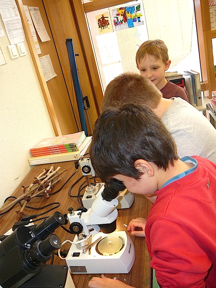 2013-04-05 CE1 - Les élèves observent les fleurs au microscope pour en faire un schéma