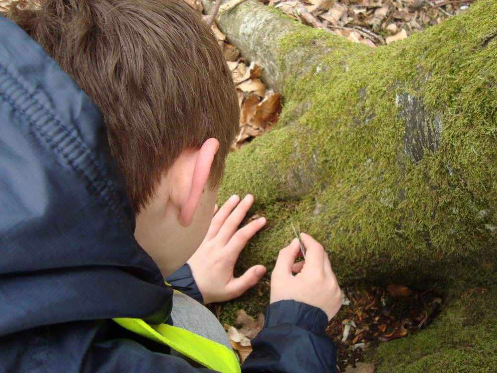 Recueil de mousse sur une souche à la pince par un élève.
