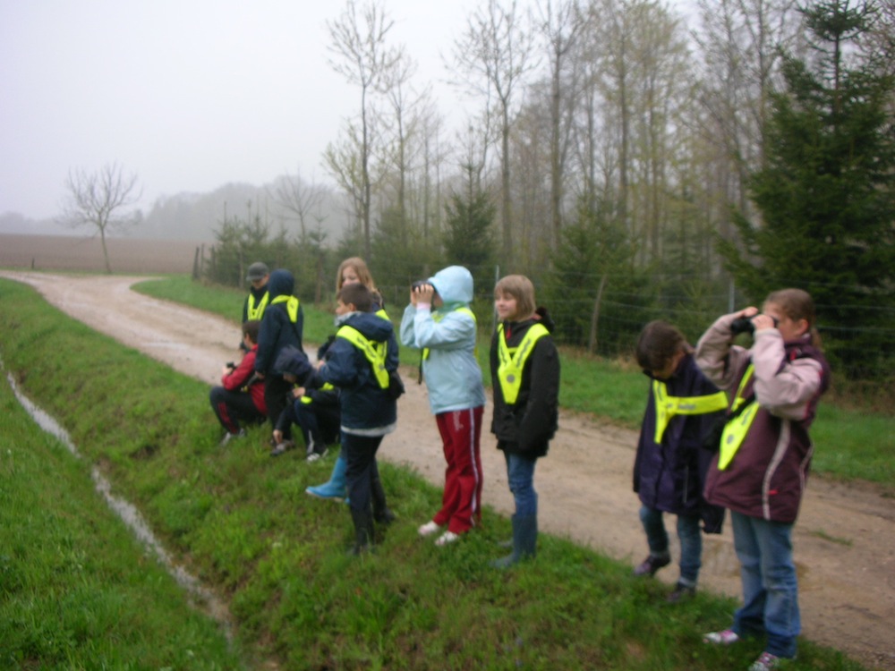 Un groupe d'élèves de la classe de CE2-CM1 monolingue attendent l'arrivée d'oiseaux à observer.