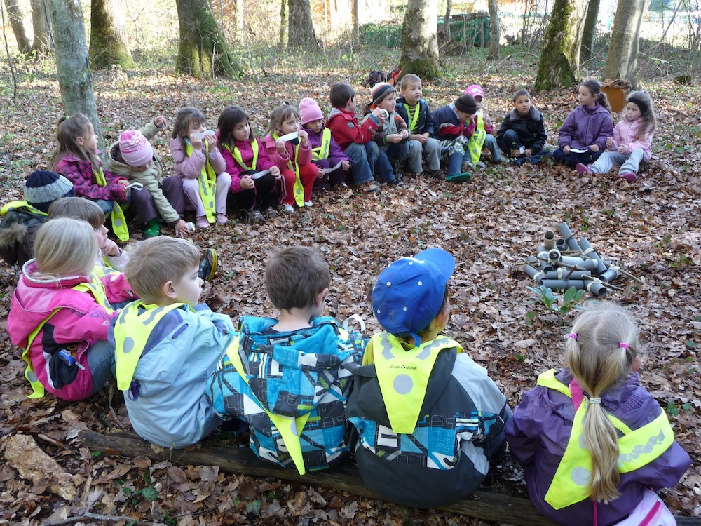 Les grands de l'école maternelle de Waldighoffen sont concentrés pour écouter les chants d'oiseaux de la forêt, dans le cadre du projet de sentier pédagogique.