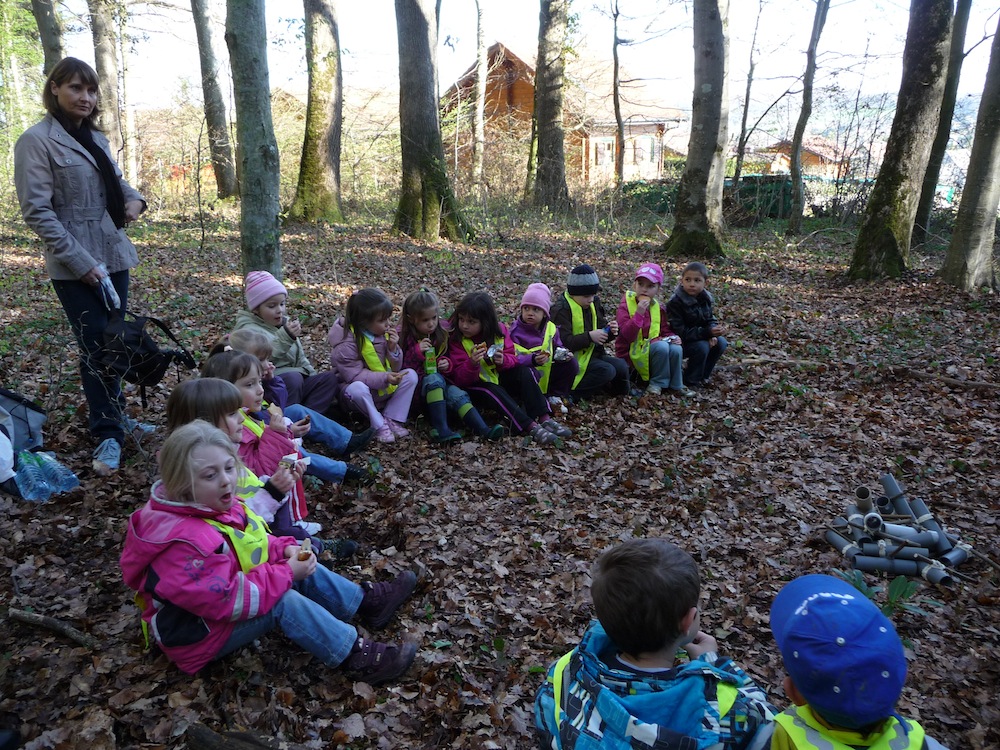 La pause goûter bien méritée, en plein air, pour les élèves de la maternelle, dans le cadre du projet de sentier pédagogique dans la forêt de Waldighoffen.