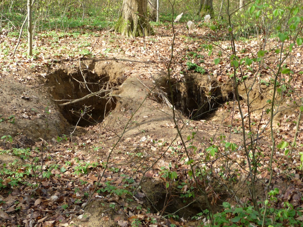 Nous avons trouvé un magnifique terrier de blaireaux. Il y a beaucoup d'entrées (ou de sorties) tout autour. Ces trous s'appellent des gueules. Eh oui, ici ce n'est pas un gros mot!