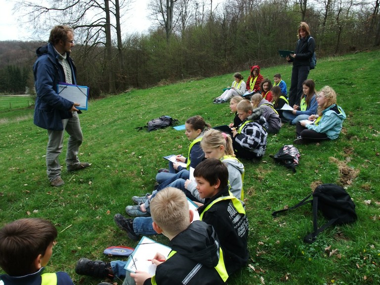 - Les élèves sont assis dans un pré, sur les hauteurs du village, et sont chargés d'analyser le paysage local pour le sentier pédagogique.