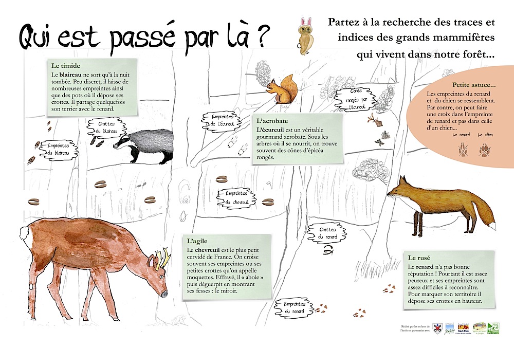 Le septième panneau du sentier pédagogique de Waldighoffen, créé par les élèves avec la Maison de la Nature, pour aider à reconnaître les traces des animaux.
