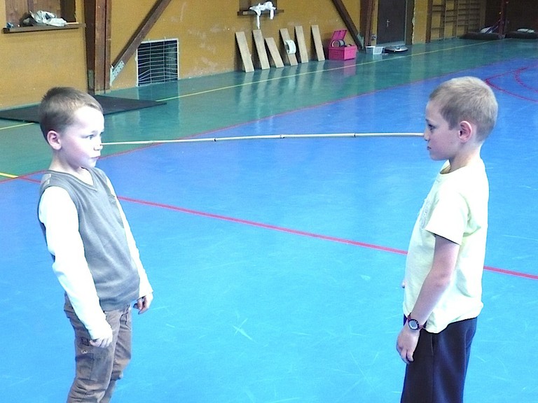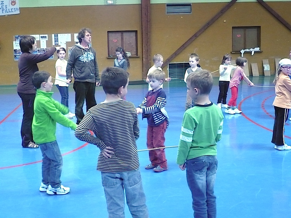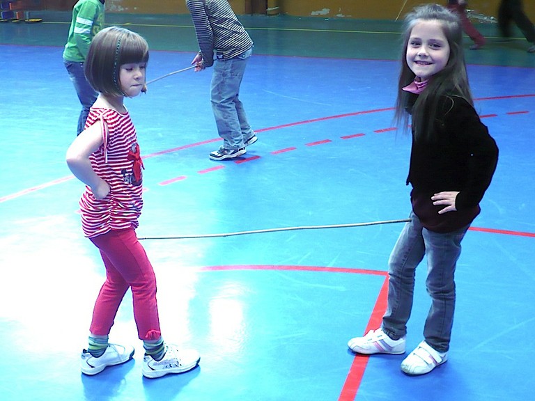 Deux élèves de CP maintiennent une baguette de bambou en équilibre et sans les mains Deux élèves de CP maintiennent une baguette de bambou en équilibre et sans les mains