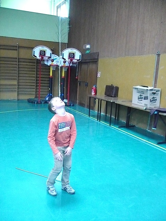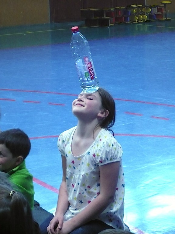 Deux élèves de CP maintiennent un bambou en équilibre sans les mains mais avec le bout du nez Deux élèves de CP maintiennent un bambou en équilibre sans les mains mais avec le bout du nez