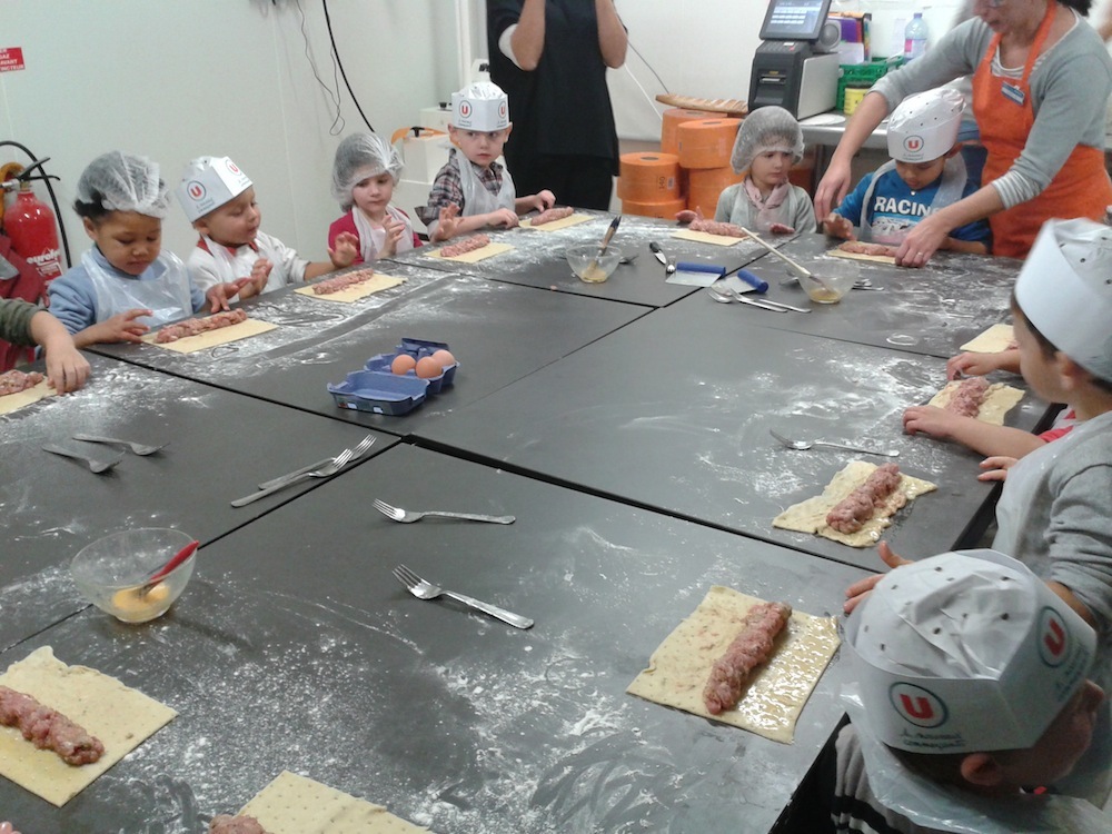 Chacun a façonné la farce en petit boudin et la disposé sur un morceau de pâte feuilletée. Le travail a été bien fait.