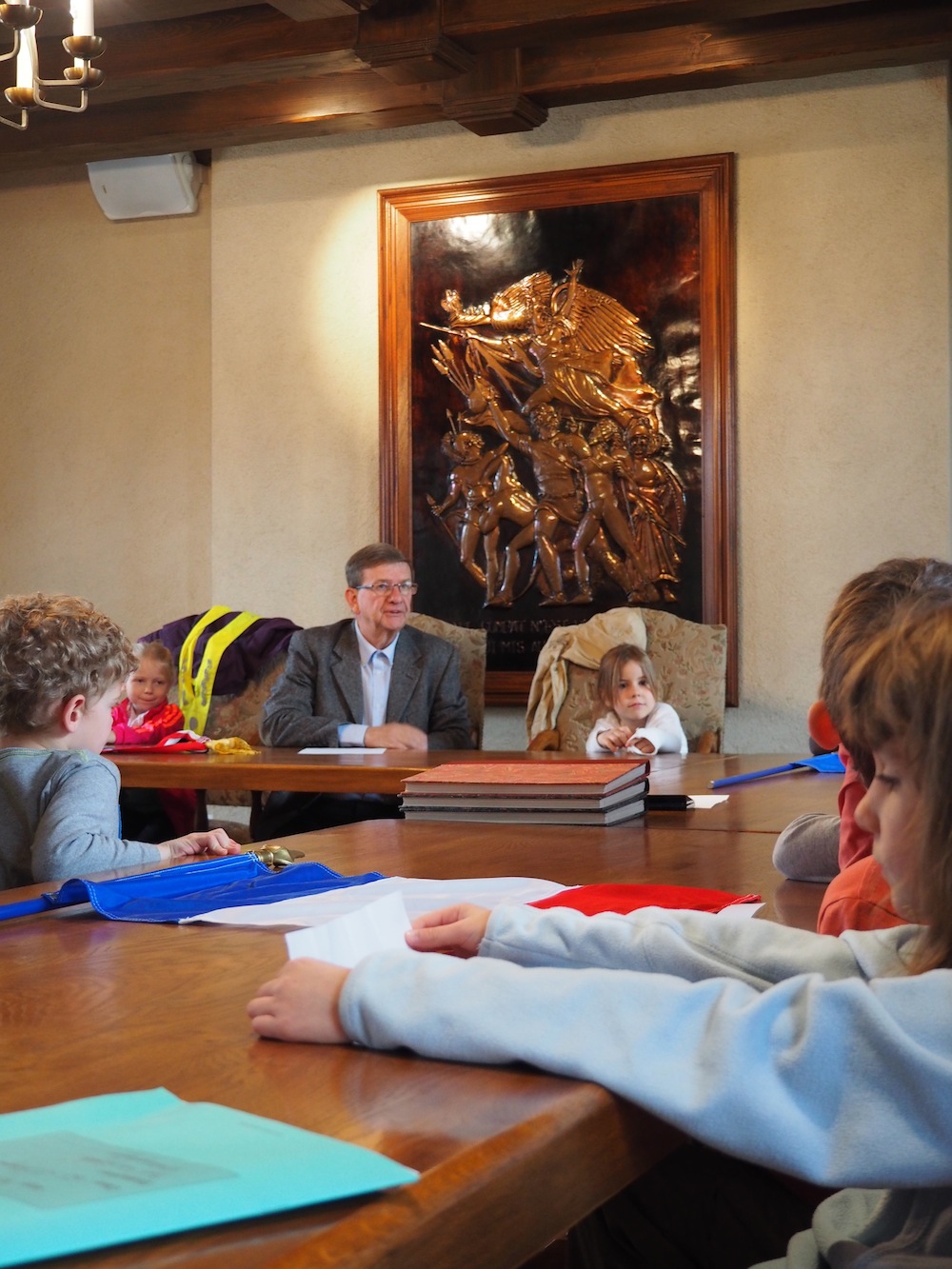 Le Maire répond à une question sur les symboles de la République, posée par un des élèves de la classe des GS/CP bilingue de Madame BESADA.