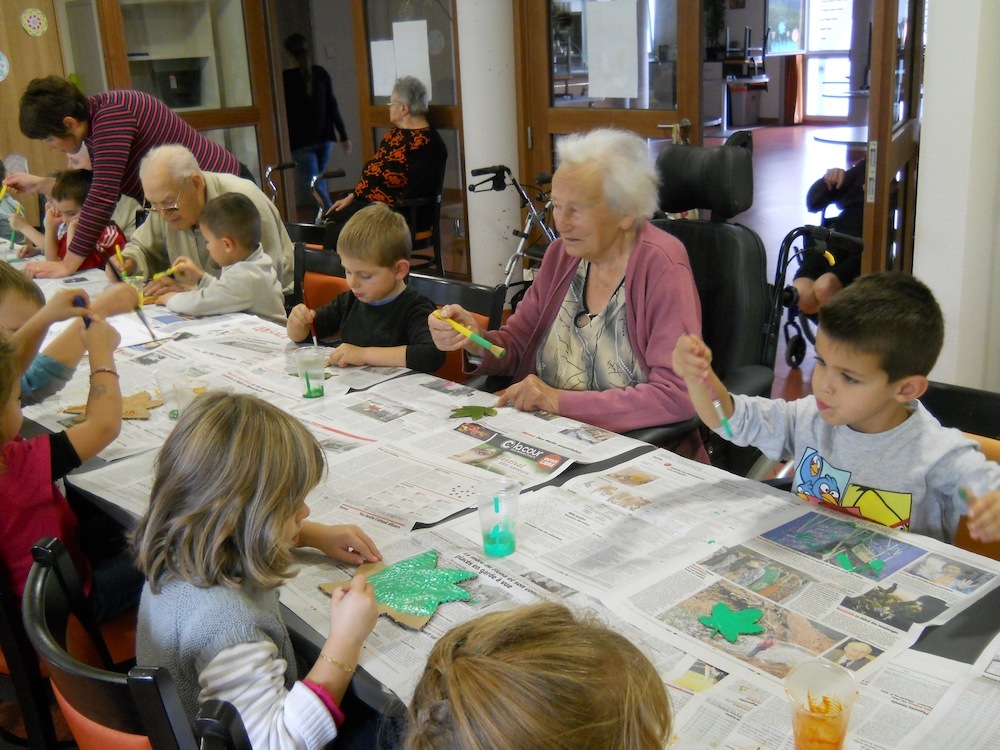 Les élèves et les pensionnaires peignent en vert des feuilles découpées dans du carton.
