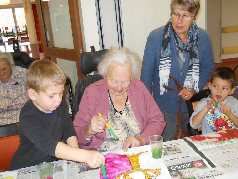 Une pensionnaire ravie de participer à cet atelier de peinture avec les élèves de l'école de Waldighoffen.