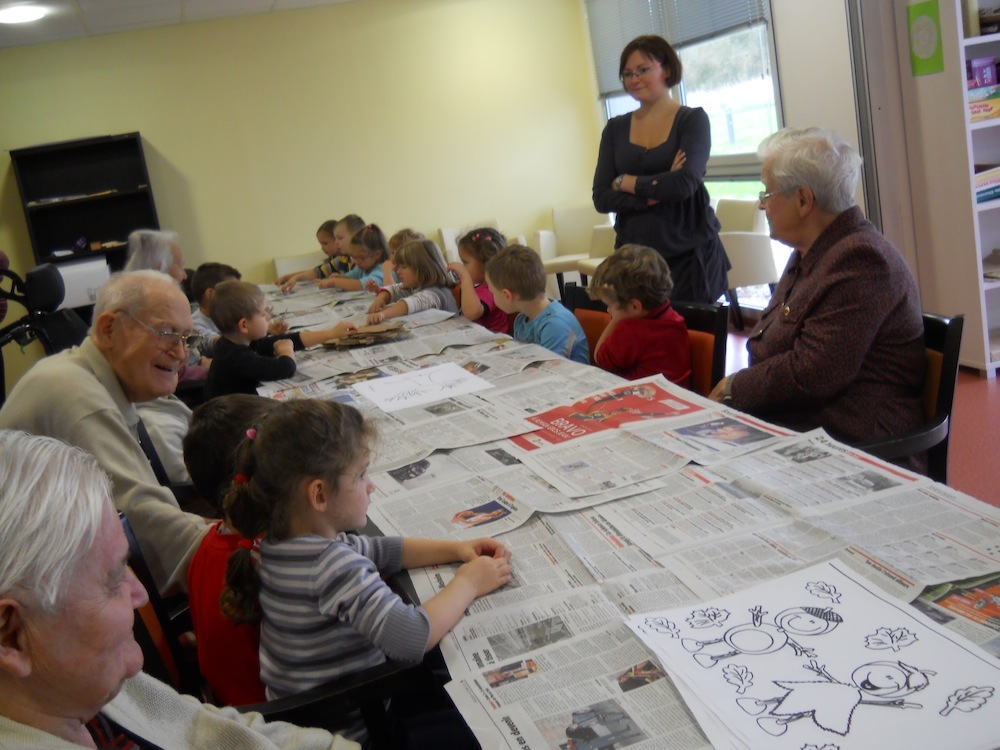 Une grande tablée d'élèves et de pensionnaires avant de débuter un atelier d'art plastique à l'EHPAD de Waldighoffen.