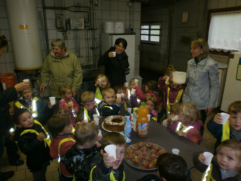 Les enfants lèvent leur gobelet de lait à la santé des Christiane et Gérard Schur et de leurs vaches.