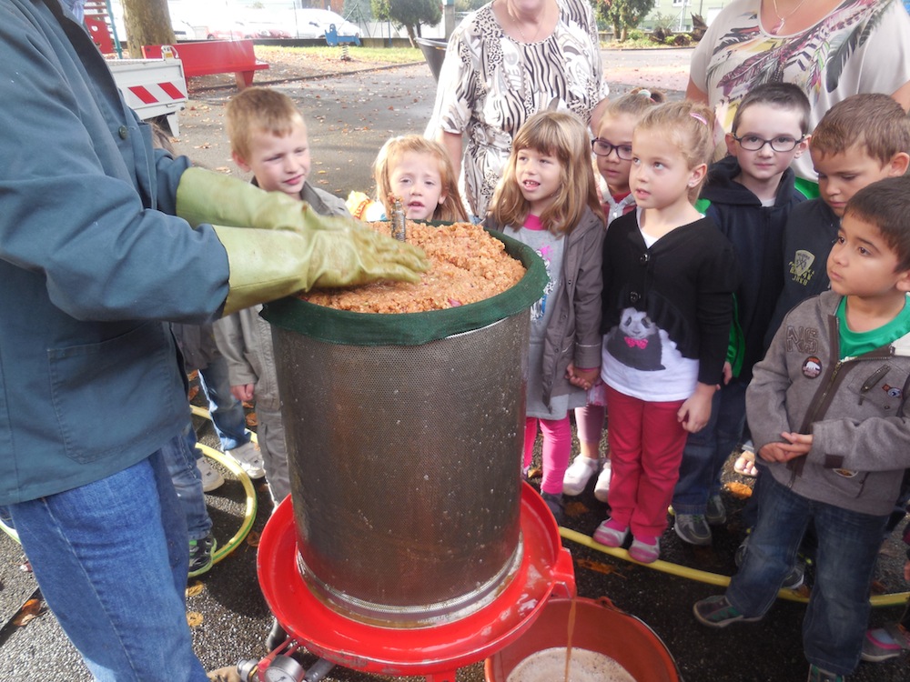 Le pressoir rempli de pommes broyées et le jus qui coule sous les regards émerveillés des enfants.