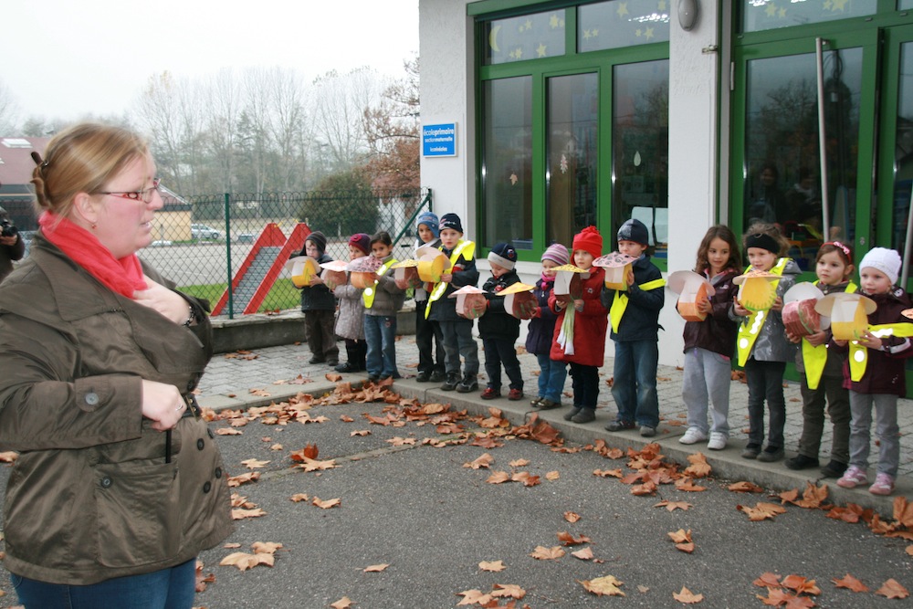 La maîtresse en allemand des 2 classes bilingue de l'école maternelle de Waldighoffen pendant un des chants de la Saint Martin le 10 novembre 2011.