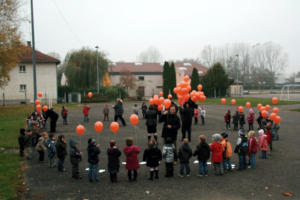 Les enseignants aidés des 2 Atsem et des représentants des commerçants ont distribué un ballon gonflé à l'hélium a chaque enfant de l'école maternelle de Waldighoffen pour le lâcher de ballon du 10 novembre 2011.