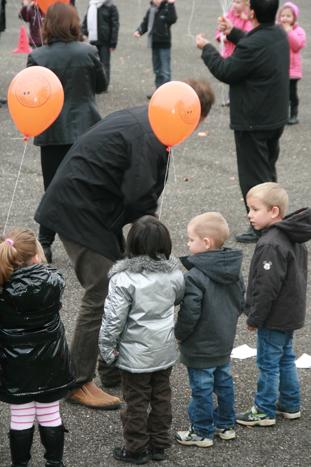 Le maître monolingue Florent Schmitt remet un ballon gonflé à l'hélium à une élève de l'école maternelle pour le lâcher de ballon du 10 novembre 2011, organisé par les commerçants de Waldighoffen.