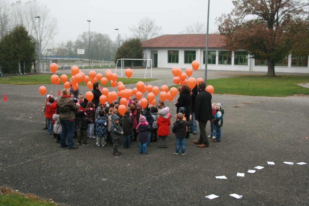 Les élèves participants au lâcher de ballons de la semaine de la gentillesse des commerçants de Waldighoffen se sont tous regroupé au milieu de la cours de l'école.