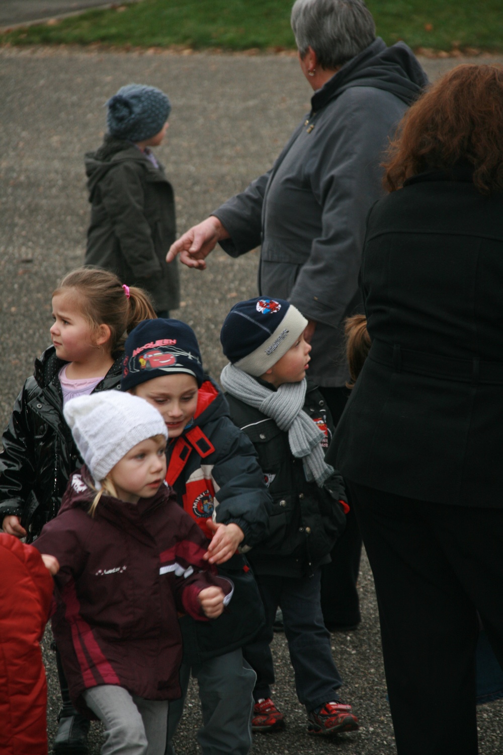 Des élèves de l'école maternelle de Waldighoffen en train de se regrouper pour retourner en classe après le lâcher de ballons du 10 novembre 2011.