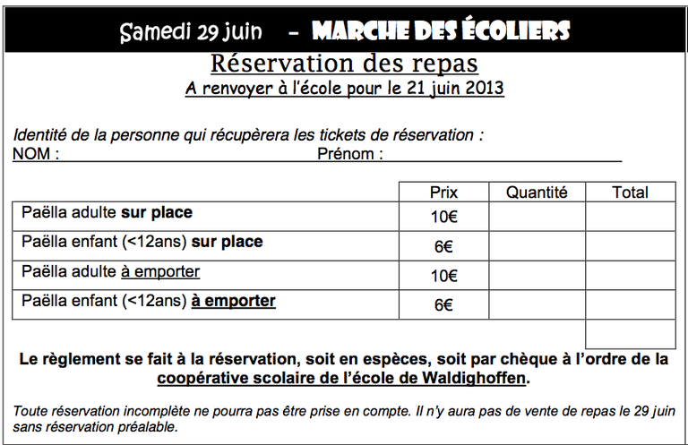 - Le bon de réservation de la paëlla sur place ou à emporter pour la fête de l'école et l'inauguration des sentiers pédagogiques le 29 juin 2013.