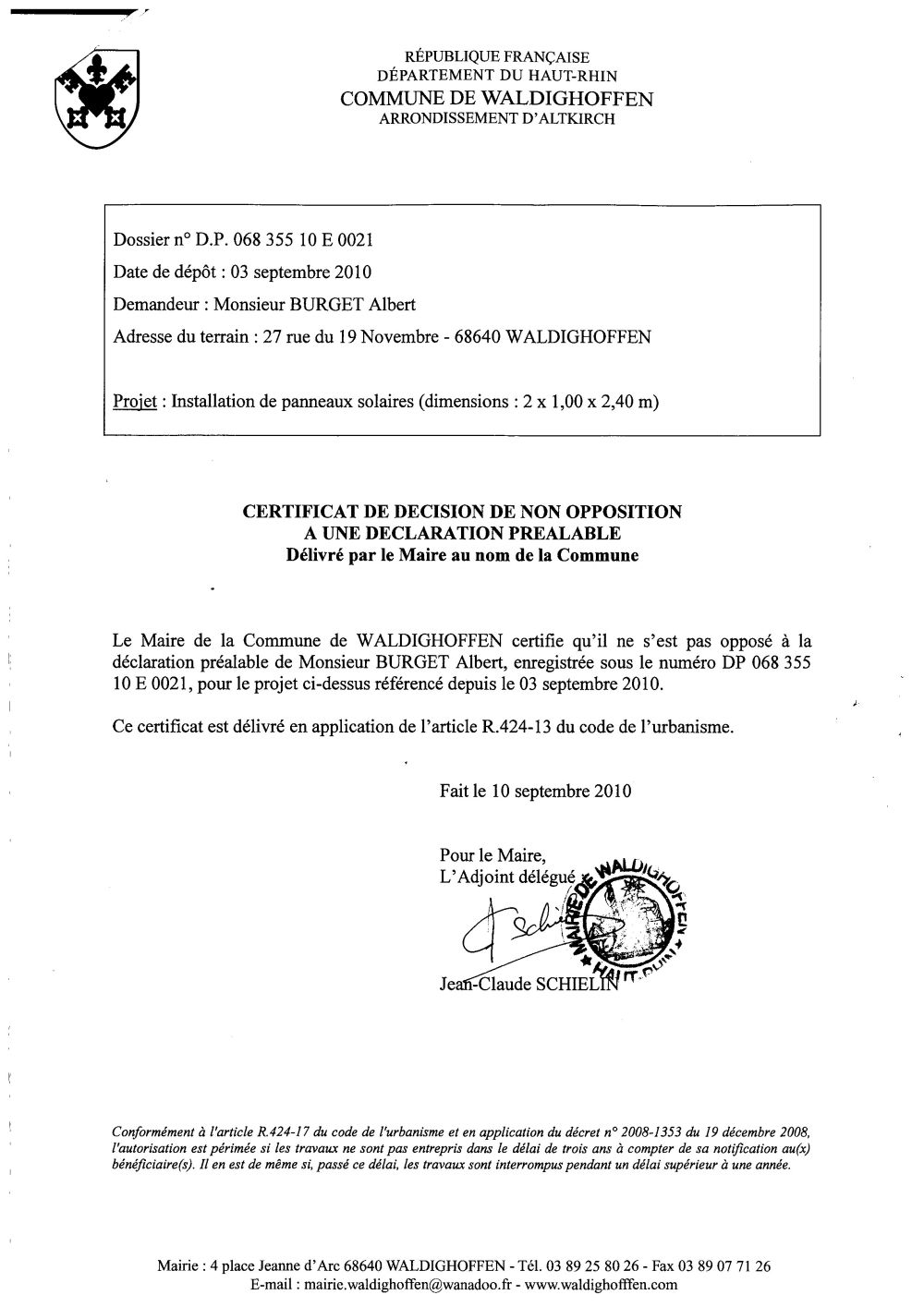 Arrêté de non opposition de la déclaration préalable n° DP 068 355 10 E 0021 - déposée par M. BURGET Albert le 03 septembre 2010.