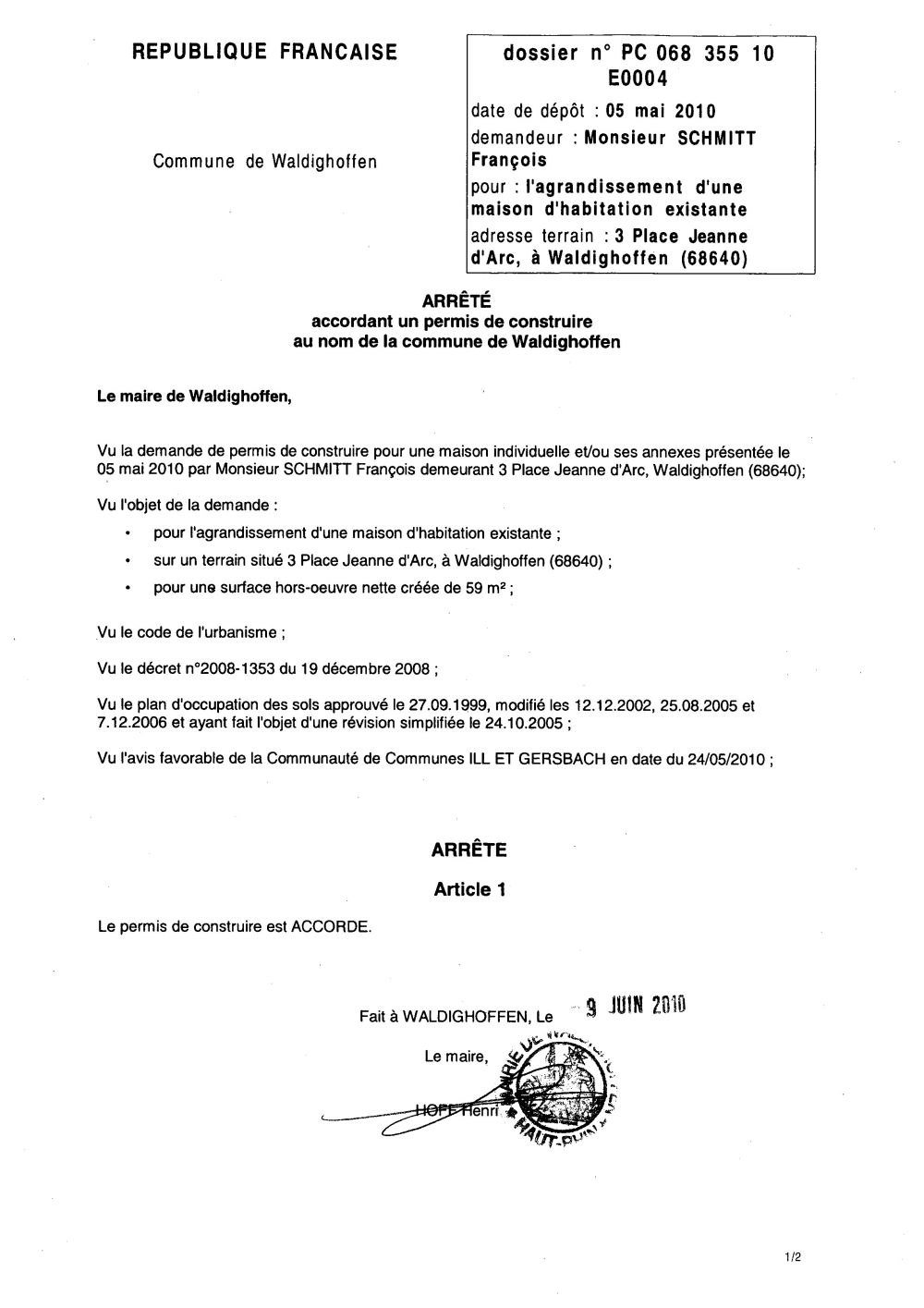 Arrêté accordant le permis de construire n° 10E0004 - M. François SCHMITT